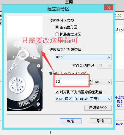 其他的默认即可,把新分区大小填下即可(建议C盘大小不要低于20G)。