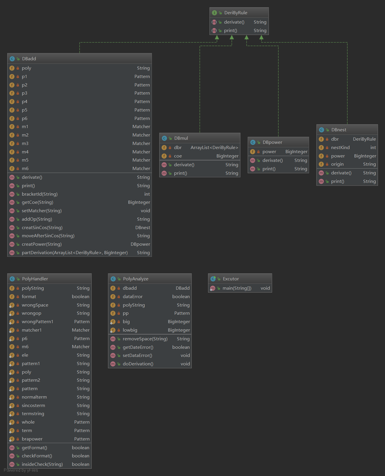 第二次作业引入了简单三角函数,并增加了他们与幂函数之间的乘法规则。这次的类图显然复杂了不少(把一大把正则的Pattern和Matcher丢到了属性里去是一个重要原因)。此外,这次求导部分的耦合度有所减轻,但是三角函数的简单合并与输出部分仍然十分复杂。原因应该于ArrayList的频繁遍历有关。