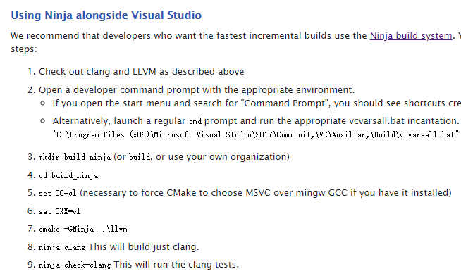 网络上搜到的用cl.exe编译、用Ninja构建的例子,是Windows下编译clang源码中的 官方步骤 中给出的: