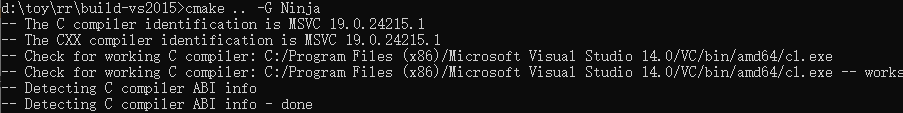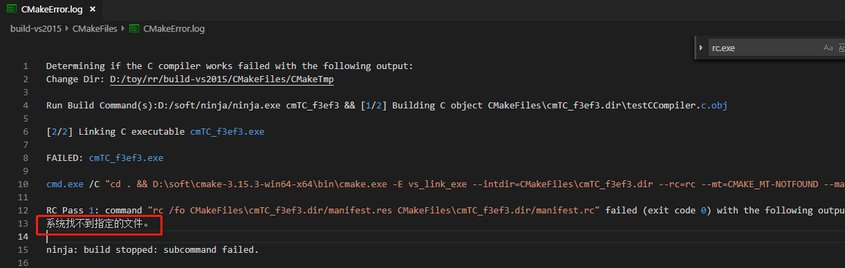 翻看D:\toy\rr\build-vs2015\CMakeFiles\CMakeError.log,提示: