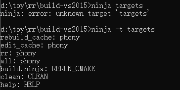 个人觉得最有必要的一条是,ninja -t targets,查看有哪些targets。因为是Windows下的cmd操作,没有Ubuntu下的bash的自动补全,没法用Tab补全,所以,这个命令需要记住。