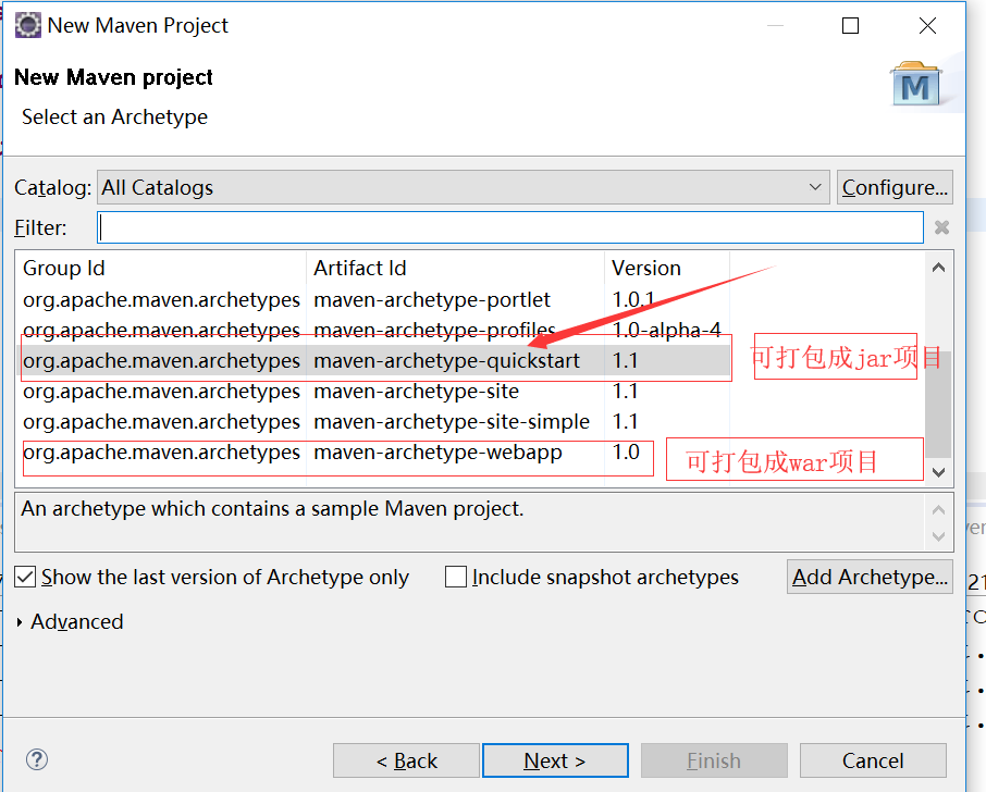 next ,普通Java项目 选择quickstart 标红一项;javaweb项目 选择 webapp标红一项。此处是普通java项目 选择第一项。