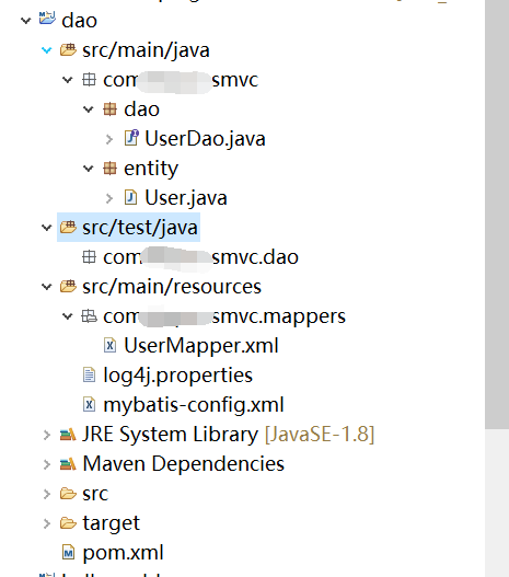 此处说明下: main 目录下创建 dao和 entity的 package 对应的存放*Mapper.xml的mappers 的package需要放在resources目录下(推荐) 。如果 mappers的package放在 main下 dao 和 entity同一目录下 ,则 需要注意解决一下上文提到的mapper.xml找不到错误的问题。