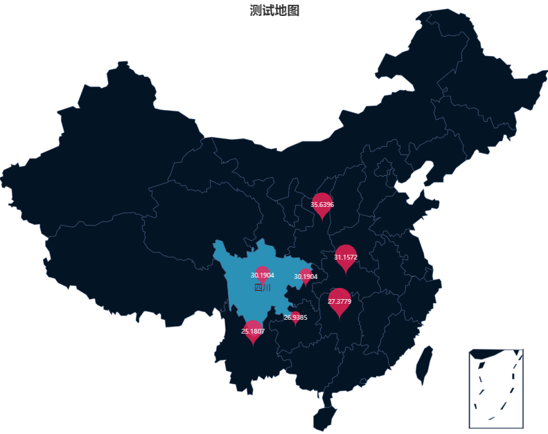 注:这里是使用的geojson文件绘制的地图,可以直接获取到里面的数据,也可以使用echarts给的地图js来绘制地图,但是没办法获取到文件里的数据,也无法在上面展示散点图,可以在3Dmap里使用。