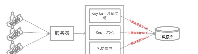 缓存雪崩: 当缓存服务器重启、或者大量缓存集中在某一个时间段失效,这样在失效的时候,也会给后端系统(比如DB)带来很大压力,造成数据库后端故障,从而引起应用服务器雪崩。