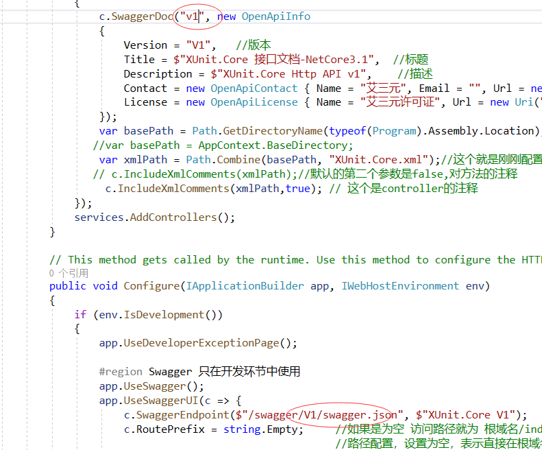 Configure 方法中的 app.UseSwaggerUI(c => 调用 c.SwaggerEndpoint("/swagger/V1/swagger.json;