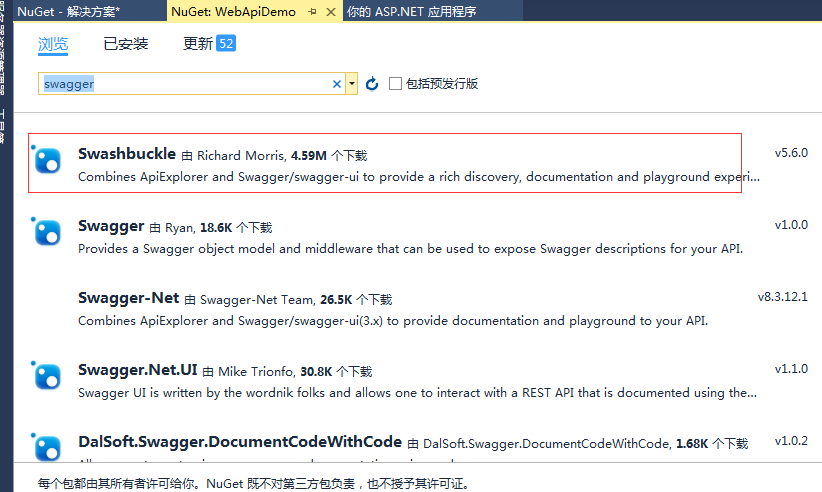 右击项目,选择管理NuGet程序包,搜索swagger,为WebApi安装swagger
