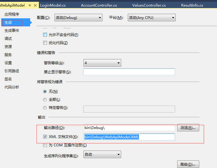 右击WebApiModel项目属性-->生成,勾选XML文档文件,为WebApiModel生成项目Xml文档