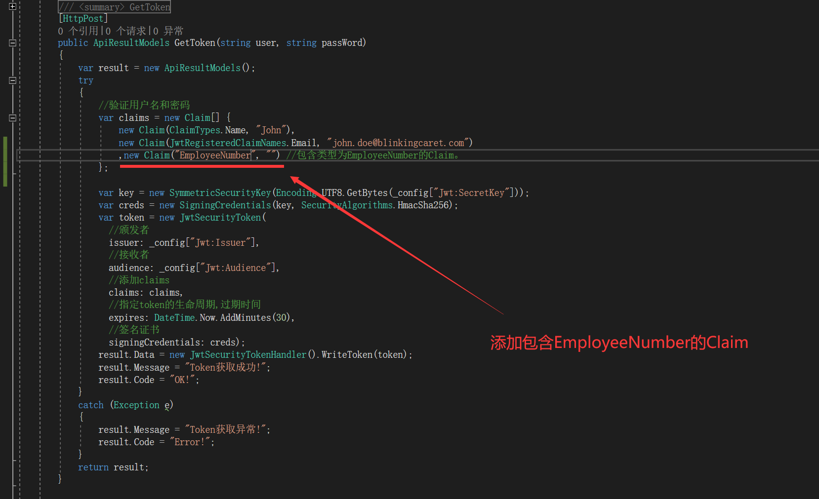 然后在CommonController.cs生成token的action中的Claim中添加EmployeeNumber