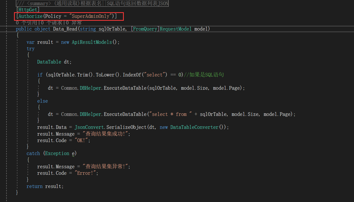 最后在需要权限认证的地方使用标签 [Authorize(Policy="EmployeeOnly")]