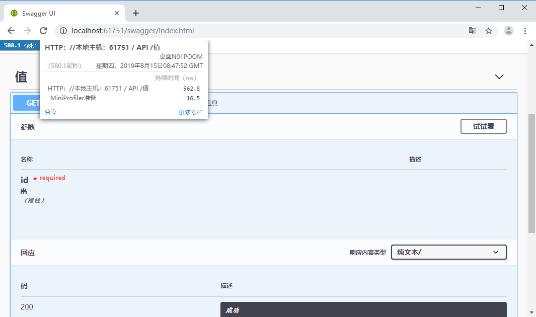现在已经配置好了 MiniProfiler 和 Swagger了,运行页面左上角