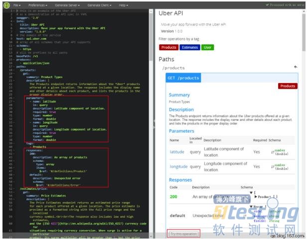 Swagger提供了Swagger Editor和Swagger UI的在线demo,如下图。可以看出,Swagger可以完整地定义一个接口的内容,包括各个参数、返回值的具体结构、类型,Swagger Editor可以实时进行编辑并在线调试。编辑好的API可以导出为json文件,使用Swagger UI打开即可以看到更美观的接口文档。