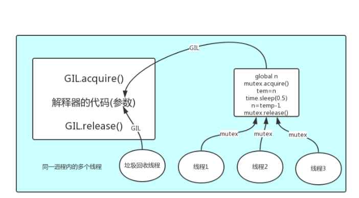 在一个python的进程内,不仅有test.py的主线程或者由该主线程开启的其他线程,还有解释器开启的垃圾回收等解释器级别的线程,总之,所有线程都运行在这一个进程内,毫无疑问