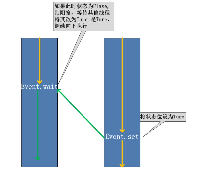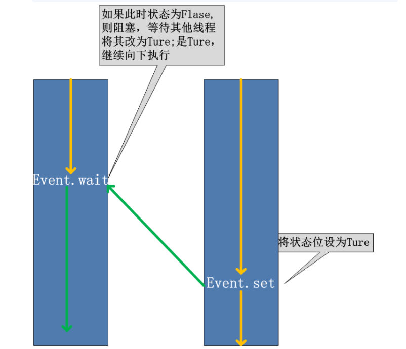 event.set(): 设置event的状态值为True,所有阻塞池的线程激活进入就绪状态, 等待操作系统调度;