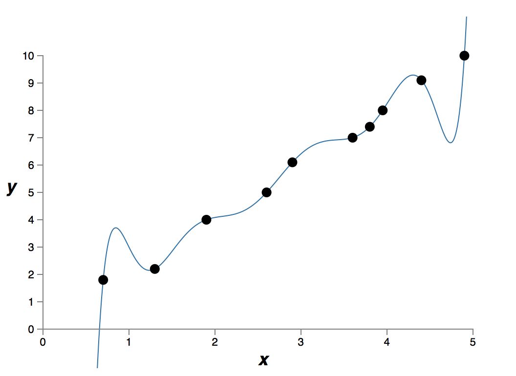 例如下图中,黑点表示我们目前已知的样本点分布,蓝色曲线表示某个非线性函数公式,刚好能够完美拟合这个样本集: