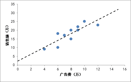我们把广告费和销售额画在二维坐标内,就能够得到一个散点图,利用一元线性回归做出一条拟合直线,y = ax + b。