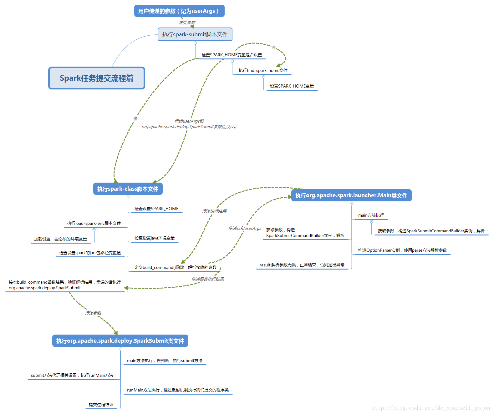 检查SPARK_HOME的值----》执行load-spark-env.sh文件,设定一些需要用到的环境变量,如scala环境值,这其中也加载了spark-env.sh文件-------》检查设定java的执行路径变量值-------》寻找spark jars,设定一些引用相关类的位置变量------》执行类文件org.apache.spark.launcher.Main,返回解析后的参数给CMD-------》判断解析参数是否正确(代表了用户设置的参数是否正确)--------》正确的话执行org.apache.spark.deploy.SparkSubmit这个类
