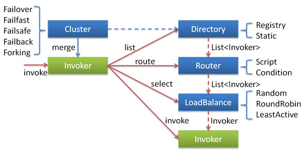 Dubbo集群模块的目的是将集群Invokers构造一个透明的Invoker对象,其中包含了容错机制、负载均衡、目录服务(服务地址集合)、路由机制等,为RPC层提供高可用、高并发、自动发现、可治理的SOA特性。