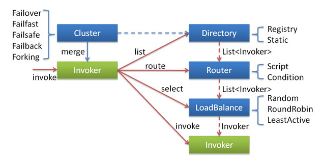 在上面的 Cluster 章节中我们知道,调用时首先会经过 MockerClusterInvoker 拦截 Mock 设置,然后再根据配置调用实际的 Invoker(默认是 FailoverClusterInvoker)。