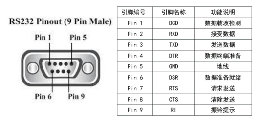 DB9接口定义以及各引脚功能说明如下图所示,我们一般只用到其中的2(RXD)、3(TXD)、5(GND)引脚,其他引脚在普通串口模式下一般不使用,如果大家想了解,可以自行百度下。