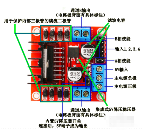 图中,通道A和通道B分别连接电机的两端(两端无方向性,关乎电机正反转);电源正负极分别接到图示主电源正负极(≤5V接到5V输入,≥5V接到12V);A、B相使能端靠外接线端接入3、5、6、9、10、11等任意两个接线端带~的接线端,此处接到D10 D11,靠内一侧的两个引脚悬空或接5V连线端;1,2,3,4输入端分别接入数字端口D4 D5 D6 D7。