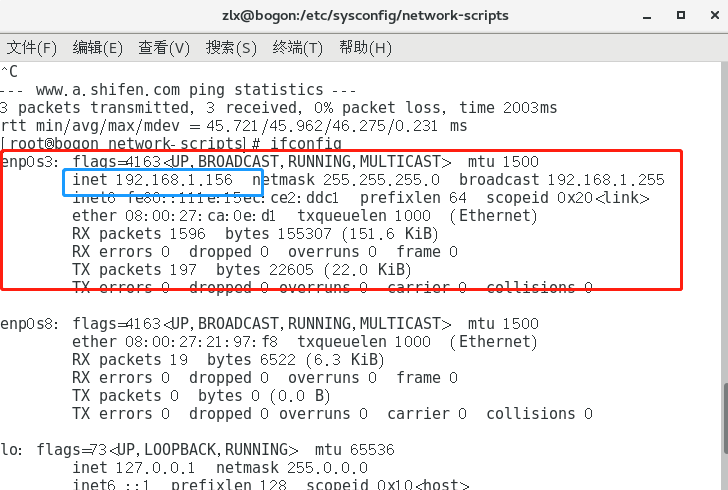 - ifconfig再次查看网卡信息并获取到网卡的名称eth0s3