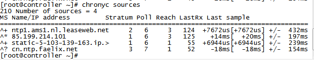 在控制节点和计算节点分别执行chronyc sources,出现截图如下