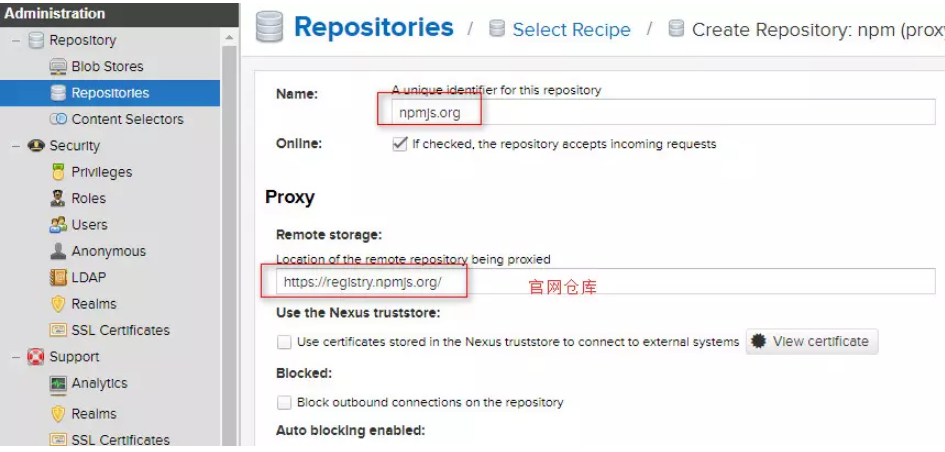npm(proxy), 输入 Name: npm-proxy, remote storage 填写 https://registry.npm.taobao.org 或 https://registry.npmjs.org. 用于将包情求代理到地址地址