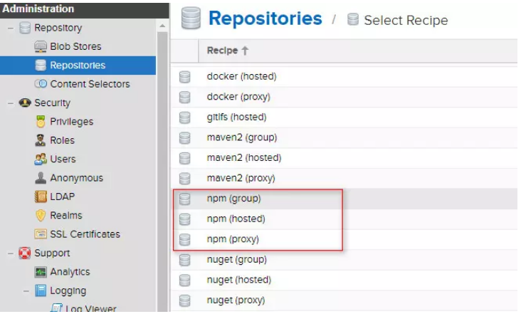 npm(group)表示分组,npm(hosted)表示本机私有,npm(proxy)表示远程代理。