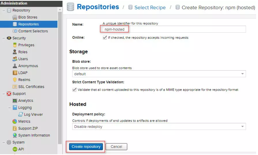 再次点击Create repository按钮., 增加 npm(hosted) 输入 Name: npm-hosted 用于存放自己的私有包