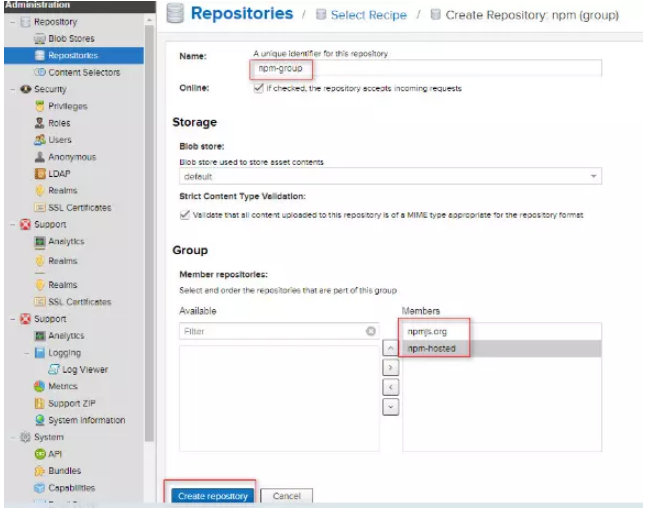 再次点击Create repository按钮.,增加npm(group) 输入 Name: npm-all, 下面Member repositories里选择之前添加的2个移动右边