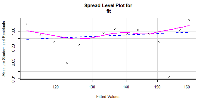 spreadLevelPlot()函数创建了一个添加了最佳拟合曲线的散点图,展示了标准化残差绝对值与拟合值得关系。