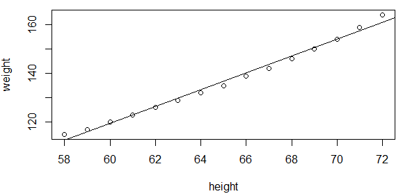 > plot(women$height, women$weight,xlab='height',ylab='weight')