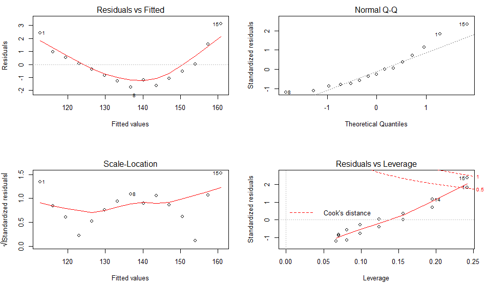 线性相关性:若因变量与自变量线性相关,那么残差值与预测(拟合)值除了系统误差之外,就没有任何关联。在残差和拟合图(Residuals VS Fitted)中,可以看到一条曲线,这暗示着可能需要对拟合模型加上一个二次项。