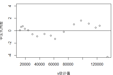 plot(fitted(fm),t,xlab = "y估计值",ylab = "学生化残差",ylim = c(-4,4))