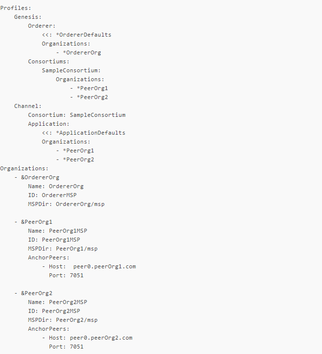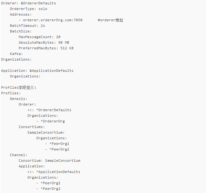 1)Profiles: 包含了通道的配置模板,通过configtxgen工具的参数 -profile 来指定使用哪个模板。