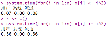 system.time(for(i in 1:n) x[i] <- i^2)