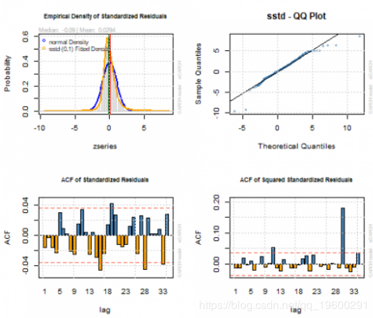 所有系数都具有统计显着性。没有找到标准化残差或标准化平方残差的相关性。模型可以正确捕获所有ARCH效果。调整后的Pearson拟合优度检验不拒绝零假设,即标准化残差的经验分布和所选择的理论分布是相同的。然而: