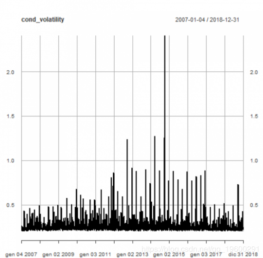 以下是我们的模型ARMA(2,2)+ eGARCH(1,1)产生的条件波动率图。