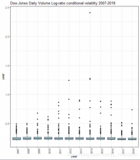 对于对数回报,我们构建了ARMA-GARCH模型(指数GARCH,特别是作为方差模型),以获得条件波动率。同样,可视化作为线和框图突出显示了年内和年之间的条件波动率变化。这种调查的动机是,波动率是变化幅度的指标,用简单的词汇表示,并且是应用于资产的对数收益时的基本风险度量。有几种类型的波动性(有条件的,隐含的,实现的波动率)。
