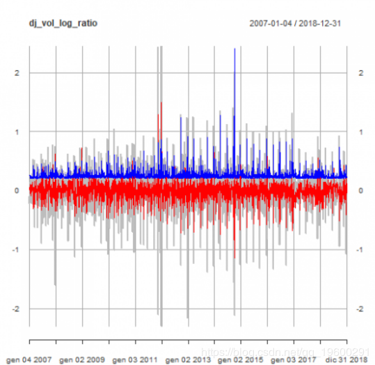 我们用平均模型拟合(红线)和条件波动率(蓝线)显示原始道琼斯日均交易量对数时间序列。