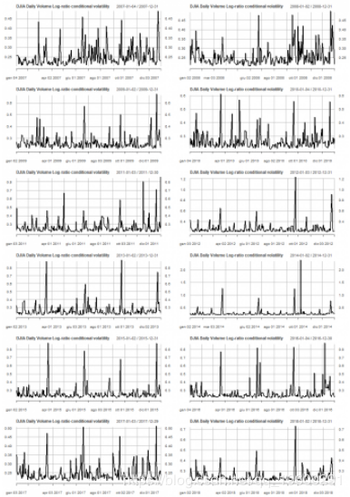 pl <- lapply(2007:2018, function(x) { plot(cond_volatility[as.character(x)], main = "DJIA Daily Volume Log-ratio conditional volatility")})
