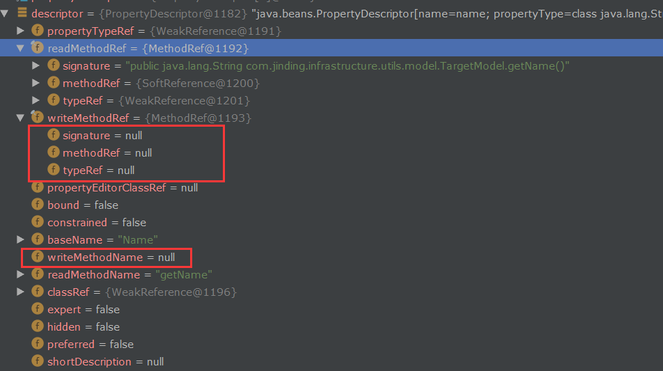 我在运行单元测试的进行调试的时候看到的PropertyDescriptor将获取不到writeMethodRef的内容和writeMethodName。