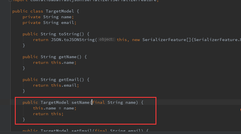 编译后的.class中的setName()将会类似于静态工厂的Builder模式将自身返回,破坏了JavaBean的setter规范。