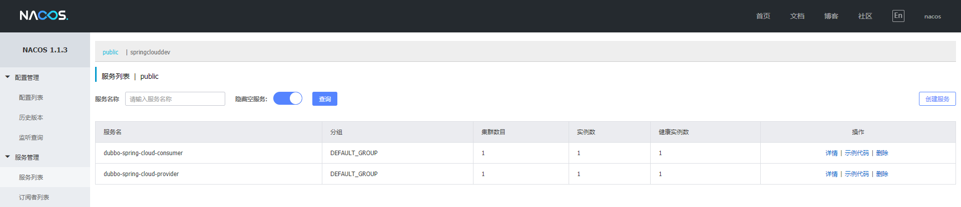 启动子工程 dubbo_provider 和子工程 dubbo_consumer ,启动完成后,我们可以访问Nacos控制台的服务列表上看到两个服务,如图: