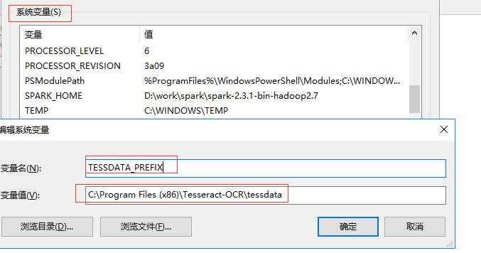 变量名TESSDATA_PREFIX,变量值:C:\Program Files (x86)\Tesseract-OCR\tessdata