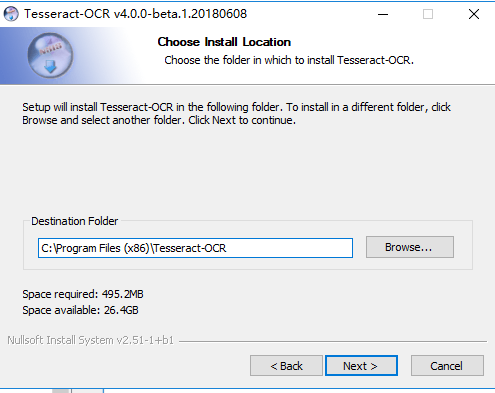 安装完后打开软件坐在目录,这里我选择的是默认目录C:\Program Files (x86)\Tesseract-OCR