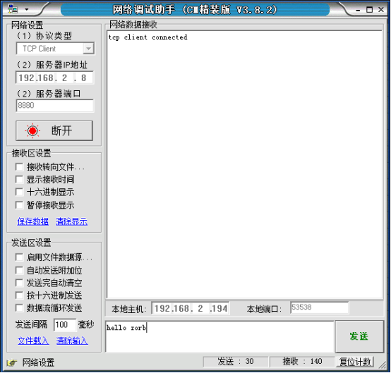 然后通过网络调试助手连接到STM32的tcp服务器: