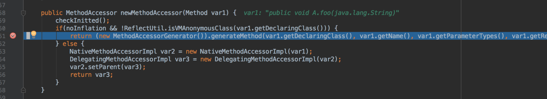 pure-Java:生成bytecode进行反射操作,即生成类sun.reflect.GeneratedMethodAccessor<N>,它是一个被反射调用方法的包装类,代理不同的方法,类后缀序号会递增。这种方式第一次调用速度较慢,较之第一种会慢3-4倍,但是多次调用后速度会提升20倍