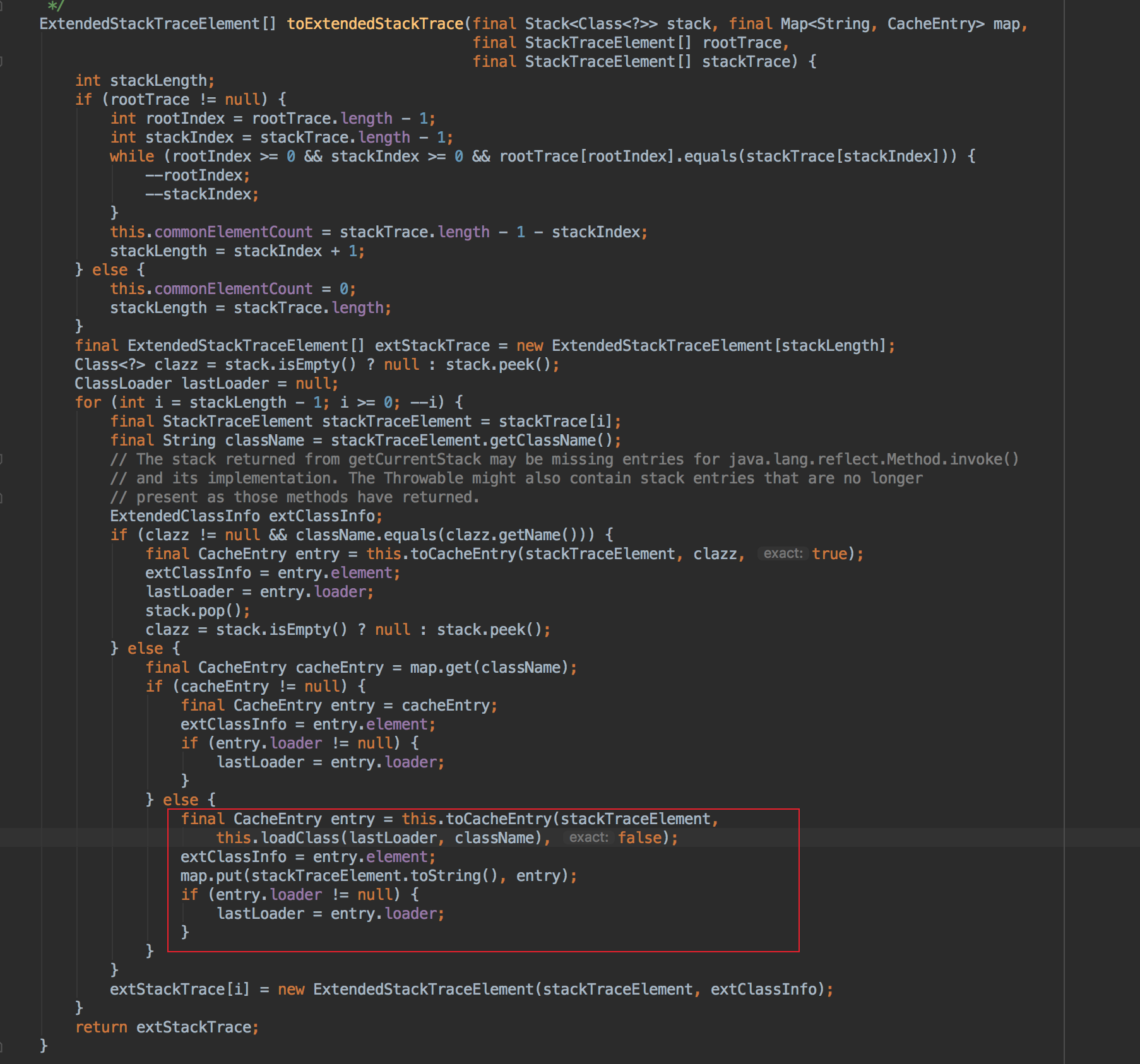 发生异常,打印异常栈时,会调用org.apache.logging.log4j.core.impl.ThrowableProxy.toExtendedStackTrace方法。